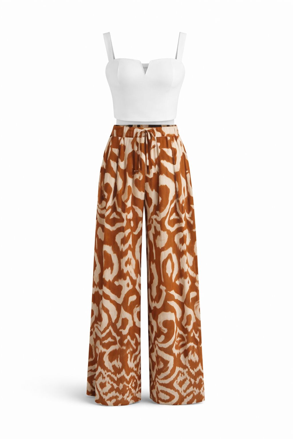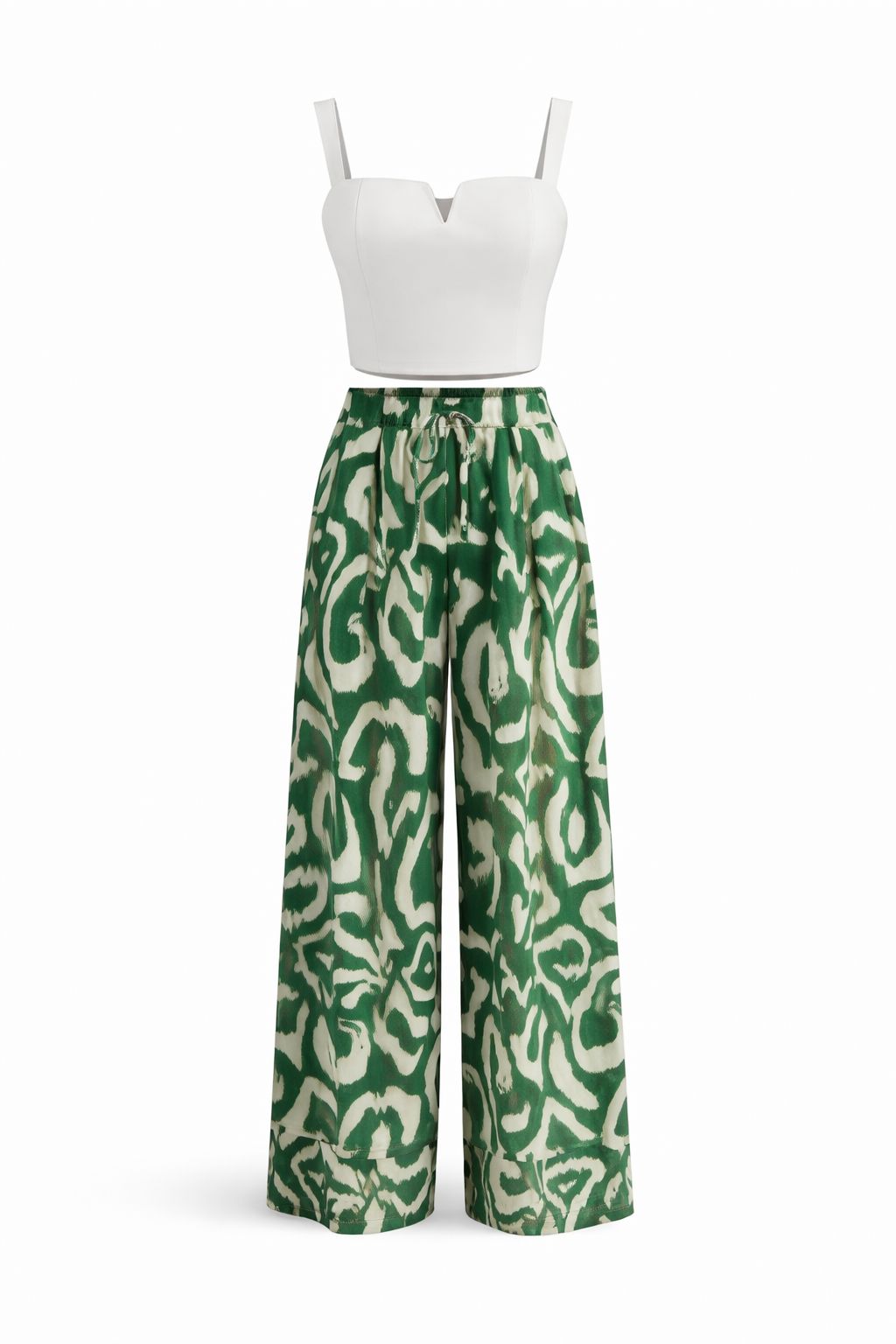 Objevte dokonalý letní outfit, který kombinuje eleganci, pohodlí a moderní styl. Tento dvoudílný set se skládá z krásného krátkého topu a volných kalhot s vysokým pasem, které lichotí každé postavě.